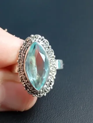 Elegante anillo de plata de ley con una llamativa piedra azul en forma de marquise. Su diseño detallado le da un toque especial. - Plata de ley. - Piedra central azul. - Diseño con detalles. - Forma de la gema: Marquise.