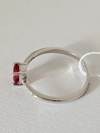 Elegante anillo con un diseño delicado y una piedra central de color rojo. - Banda del anillo en tono plateado. - Detalle de pequeñas piedras incrustadas en la banda.