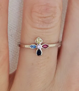 ✨ Anillo fino en plata de ley 925 con circonitas multicolor ✨ Diseño en forma de cruz con circonitas de diferentes cortes (marquesa, pera y cuadrado) en tonos fucsia, rosa claro, amarillo, azul cielo y azul intenso. Muy parecido al famoso anillo de la marca Agatha Paris, pero realizado en plata de ley 925. ✔️ Nuevo con etiqueta ✔️ Plata 1ª ley 925 (sello interior 925) ✔️ Circonitas facetadas multicolor ✔️ Talla 16 ✔️ Listo para regalo 👀 Más joyería en plata 925 en mi perfil.