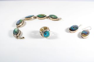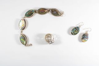 Medidas: Pulsera: 195 x 15 x 5 (an x p x al) mm y 23 g aprox. Anillo: 20 x 17 x 23 (an x p x al) mm, 6 g aprox, diámetro interior: 17,5 mm. Pendientes: 15 x 38 x 6 (an x al x p) mm, 9 g aprox . Materiales: Plata de ley 925 y conchas de abulón. Década: 70. Como nuevo. - Pulsera con varios eslabones de abulón. - Anillo con diseño calado y piedra central de abulón. - Pendientes a juego con abulón.