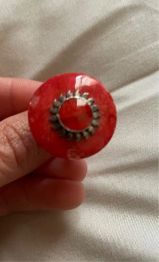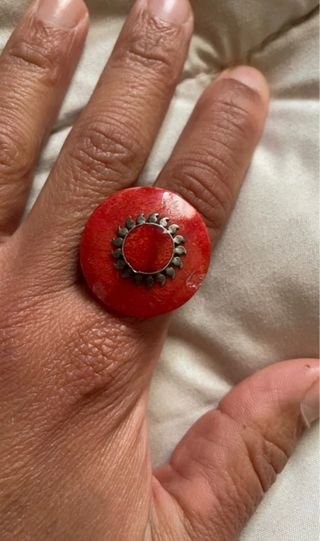 Anillo con un diseño llamativo en color rojo y detalles plateados. - Diseño circular con piedra central. - Montura con detalles ornamentales.