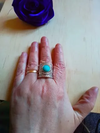 Precioso anillo de estilo boho. Es de color plata y turquesa, con una piedra ovalada central. - Diseño elegante y llamativo. - Metal de apariencia resistente. - Ideal para añadir un toque único a tu look.