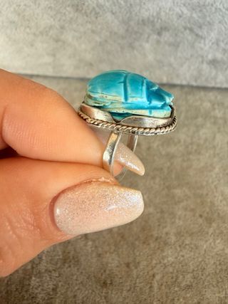 Anillo con diseño de escarabajo en piedra turquesa y montura de plata de ley. - Plata de ley 925. - Piedra con forma de escarabajo. - Detalle trenzado en el borde. TALLA 14 Envio a toda españa