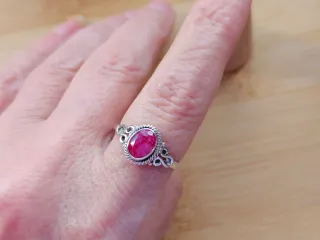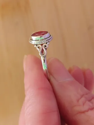 Precioso anillo de plata 925 con un rubí facetado en el centro. Su diseño es ajustable para adaptarse cómodamente a tu dedo. - Elaborado en plata 925. - Piedra central: rubí facetado. - Diseño abierto y ajustable. Pongo foto con la medida que tiene así como está. Se puede abrir o cerrar para ajustar a tu talla. Colgantes y pendientes de rubí facetado disponibles en tienda. Si quieres comprar varias cosas te hago algo de descuento Envío rápido #anillo #plata925 #rubi #ajustable #silver925