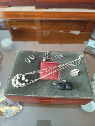 Conjunto de joyas de plata de ley. - Collar con colgantede bolas dos texturas 46 cm - Pendientes y gargantilla gota -Pendientes Onix negro -Anillo ositos talla 16 Cadena con volante a juego con pendientes gota. Se vende en lote. También se vende sueltos