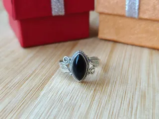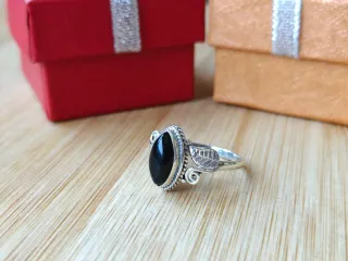 Precioso anillo de plata 925 con una piedra de onix en forma de lágrima. El diseño de la montura está inspirado en hojas y volutas, aportando un toque artesanal. Talla 19/59 ver fotos con medidas - Material: Plata de ley 925. - Piedra: Onix tallado en forma de lágrima. - Diseño: Detalles de hojas y espirales. Envío rápido #anillo #talla19 #talla59 #plata925 #onice #onix