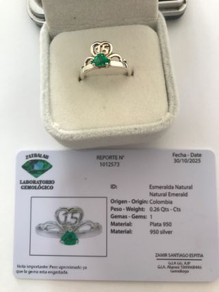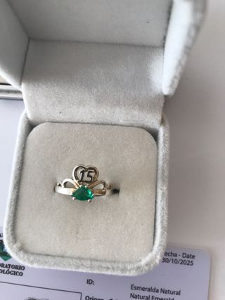 Anillo de plata Ley 950 con diseño de corona y número 15, adornado con una esmeralda, Certificado Gemologico. - Diseño de corona con el número 15. - Piedra central tipo pera. - Elaborado en plata Ley 950 -Certificado Gemologico