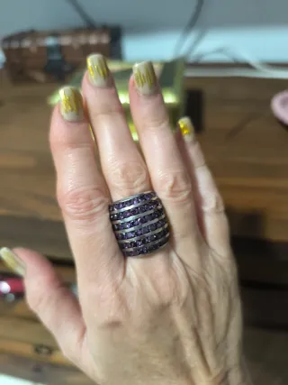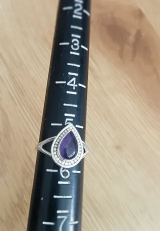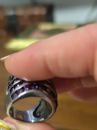 Precioso y elegante anillo en plata de ley con un baño de rodio con circonitas moradas, comprado en joyería, precio original 65 euros,muy bien conservado