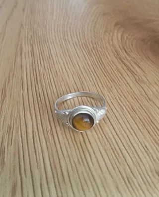 Elegante anillo de plata de ley 925 con una piedra semipreciosa de ojo de tigre. - Diseño con detalles de hojas a los lados. - Acabado pulido de la plata.
