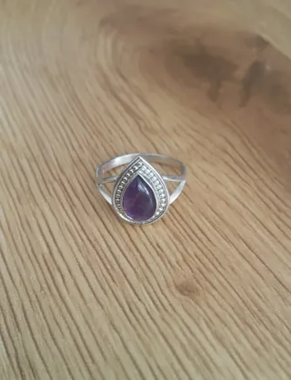 Elegante anillo de plata de ley 925 con un diseño de gota. - Piedra central de amatista. - Detalles grabados en el borde. - Montura de plata pulida.