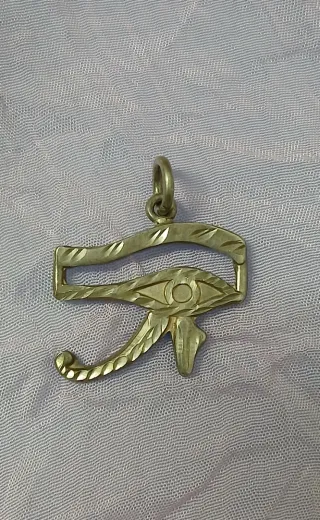Tal como se ve en las fotos. Colgante con el símbolo del Ojo de Horus. Plata Ley, pieza Vintage, años 80. Usado, muy cuidado, en buen estado como se observa. Mide 2,5 cms de largo por 2 cms alto, sin contar el anilla. Diseño muy bonito, con textura lineal.