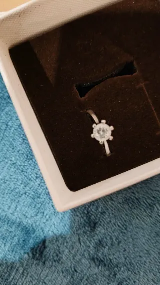 Anillo de plata de ley 925, de mujer, con diamantes pequeños incrustados en los bordes y uno grande en el medio. Está en muy buen estado. Incluyo su caja original.