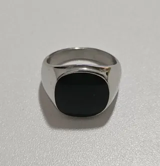 Elegante anillo de plata con una piedra negra en el centro. Un accesorio llamativo y moderno. -talla 26 hombre - Diseño de sello. - Montura de plata. - Piedra central cuadrada.