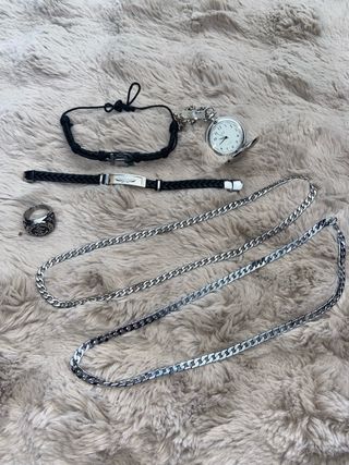 Conjunto de accesorios para hombre que incluye varios complementos. - Pulsera de cordón negro con cierre metálico. - Pulsera trenzada negra con placa. - Reloj de bolsillo plateado. - Anillo con diseño. - Dos cadenas de eslabones plateadas.