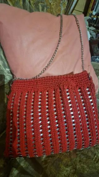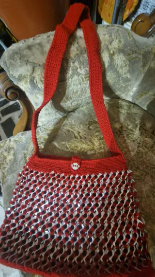 Bolso de mano o de hombro, hecho a mano con tejido rojo y adornos plateados. - Diseño único con anillas de latas. - Cadena metálica plateada para llevar al hombro. - Cierre superior. Diseños unicos echos a mano, se venden por unidad a 10€