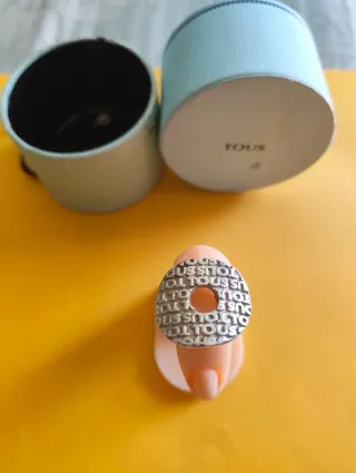 Anillo tipo sello de la marca Tous. Está fabricado en plata de primera ley (plata 925), que es una aleación con un 92,5% de plata pura. Peso 10 gramos. Medida de 1.6 cm por dentro y el frontal 2.5 x 2 cm. Características Principales: Marca: Tous Material: Plata de primera ley (plata 925) Diseño: Es un anillo tipo sello (signet ring) con forma redonda y un diseño calado que repite la palabra "TOUS" por toda la superficie. Estilo: Pieza de joyería contemporánea y versátil, que puede ser usada tanto por hombres como por mujeres.