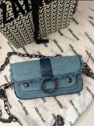 Bolso de mano Zadig & Voltaire modelo Kate. - Confeccionado en denim azul. - Adornos plateados y detalles metálicos. - Correa de cadena. - Cierre con solapa y anilla decorativa.