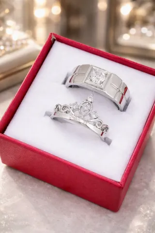 Conjunto de dos alianzas de plata con diseño ajustable. - Anillo con diseño de corona y circonitas. - Anillo liso con detalle de circonio cuadrado. - Se entrega con caja unboxing personalizada de regalo.