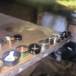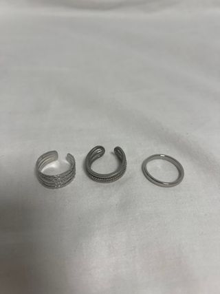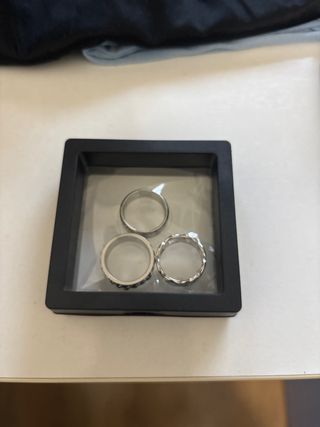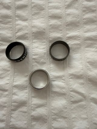 Pack 3 anillos (plateado liso + grabado + negro) | Unisex | Minimal/Street Pack de 3 anillos con estética moderna: • 1 plateado liso (ancho, estilo minimal) • 1 plateado grabado (detalle sutil) • 1 negro (look elegante/urbano) Ideales para combinar con outfits neutros o estilo smart casual. Comprados en mercado artesanal durante viaje a El Cairo.