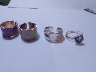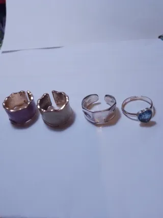 Conjunto de cuatro anillos ajustables con diseños variados. Todos usados - Dos anillos con esmalte en tonos lila y beige. - Un anillo liso plateado. - Un anillo con piedra azul en forma de corazón.