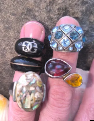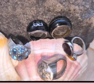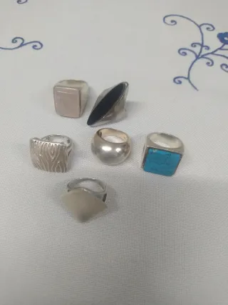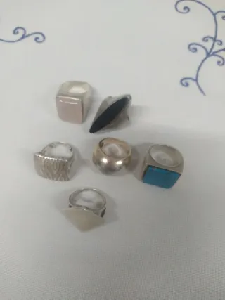 Conjunto de anillos de plata con diseños variados. Cada anillo tiene un precio de 18 euros. - Anillo con piedra rosa. - Anillo con piedra negra alargada. - Anillo con diseño texturizado. - Anillo liso y redondeado. - Anillo con piedra turquesa cuadrada. - Anillo con piedra clara en forma de rombo. Sólo recoger en domicilio no hago envíos
