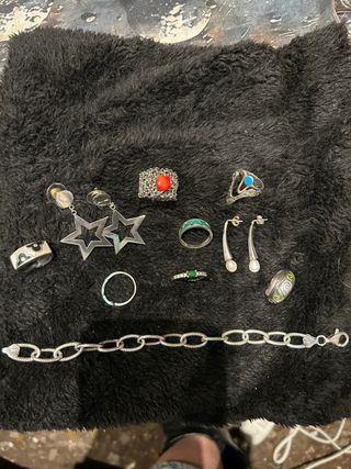 Conjunto de varias piezas de joyería de plata 925, algunas de ellas con un estilo vintage. - Anillo con piedra roja. - Anillo con piedra turquesa. - Anillo con detalles verdes. - Anillo con diseño de espiral verde. - Pendientes largos con perlas. - Pendientes de estrella. - Anillo liso. - Anillo con diseño. - Pulsera de eslabones.