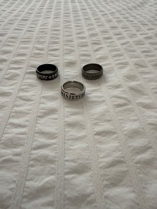 Conjunto de tres anillos con diseño de runas. - Un anillo negro con runas grabadas. - Un anillo plateado liso. - Un anillo oscuro con diseño grabado.