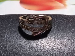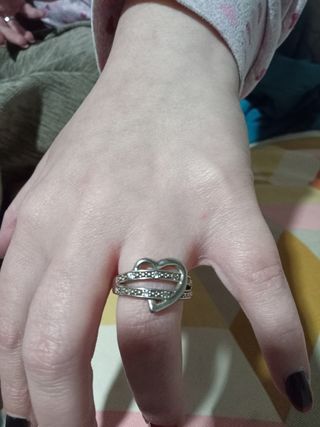 Anillo plateado con un corazón que es atravesando por distintas líneas. Tiene un motivo adornándolo, no es liso. Es muy bonito. Anillo plateado con una línea central de circonitas rodeándolo. Es muy vistoso. Los dos son aproximadamente una talla 17 pequeña.