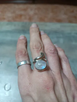 Elegante anillo de plata con una piedra luna central. Su diseño ajustable lo hace cómodo para diferentes dedos. - Diseño en espiral. - Piedra luna con destellos azules y blancos. Propiedades el mineral de la mujer,fertilidad y alivia los dolores de la menstruación,ayuda a combatir problemas de piel,los ojos y el cabello