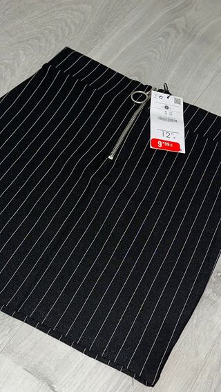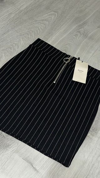 Minifalda de Bershka con un diseño de rayas verticales y detalle de cremallera frontal. - Diseño de rayas finas blancas sobre fondo negro. - Cremallera plateada con tirador de anilla. - Corte ajustado.
