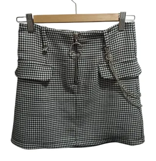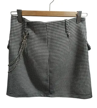 Falda corta con estampado de pata de gallo. Diseño con cremallera frontal y anilla. Cadena plateada en un lado.
