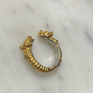 Anillo con diseño de dos cabezas de dragón enfrentadas. La pieza tiene un acabado brillante y detalles intrincados. - Diseño de dragón. - Acabado dorado y plateado.