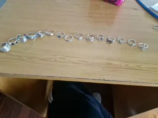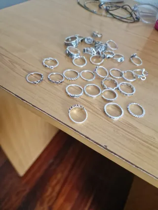 Conjunto de varios anillos plateados con diseños variados. - Diseños de mariposas, flores y otros motivos. - Anillos abiertos para ajustar a diferentes tamaños. Si quereis alguno en concreto los vendo a 1€ por separado, hago packs pequeños por 80 cent cada uno.