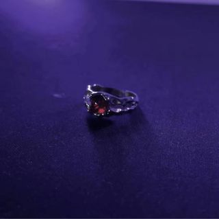 Anillo con un diseño único y una piedra central de color rojo. - Montura de plata con detalles texturizados. - Piedra de corte ovalado.