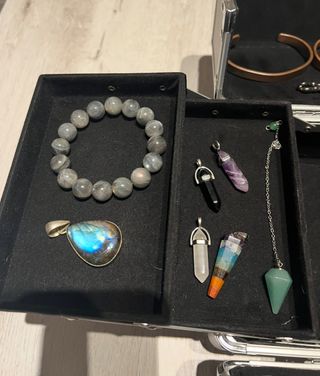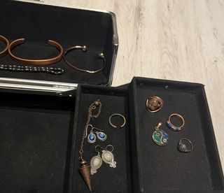 Lote exclusivo de joyería variada con piezas únicas y materiales auténticos, incluye anillos y pulseras de cobre macizo, entre ellas piezas artesanales de cobre chileno hechas a mano con diseños exclusivos, una con piedra de origen chileno, pulsera y colgante de labradorita natural, pulsera imantada, colgantes y péndulos de piedra natural auténtica como amatista, aventurina, ónix, obsidiana y cuarzo, pendientes de plata con piedra natural y caja metálica organizadora incluida, no es bisutería industrial, se vende el lote completo tal como se ve en las fotos.