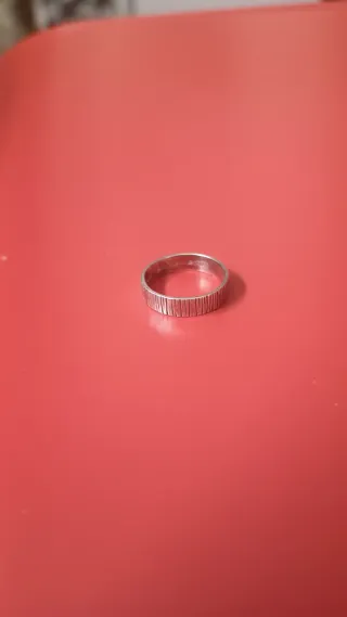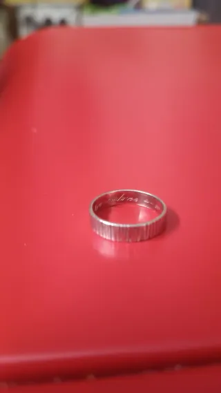 Elegante alianza de plata con un diseño único. - Material: Plata - Diseño exterior: Acabado acanalado vertical - Tiene una inscripción en el interior (tye me lane y una fecha).