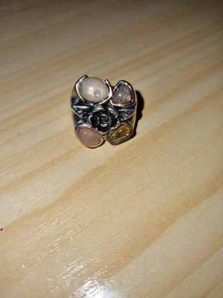 Anillo de la marca Zara con un diseño floral y varias piedras incrustadas. - Anillo de plata con detalles. - Piedras de diferentes formas y colores, incluyendo rosa y translúcidas. - Diseño central con forma de rosa.