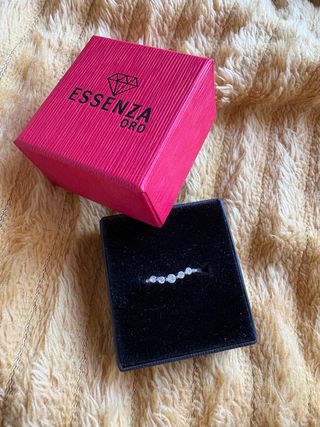 Elegante anillo de la marca ESSENZA ORO. - Diseño con varias piedras blancas. - Montura en tono plateado.