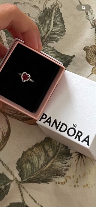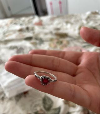 Anillo con diseño de corazón de Pandora. - Corazón central de color rojo. - Detalles en plata. - Banda adornada con pequeñas piedras.