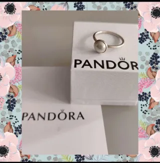 Anillo de la marca Pandora con un diseño elegante. - Perla central. - Banda plateada.