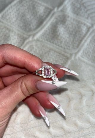 Anillo de plata con una piedra central rosa de corte cuadrado engarzada y rodeada de circonitas. Es de la talla 16 y nunca se ha usado.