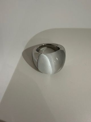 Elegante anillo con un diseño moderno y llamativo. - Banda de metal plateado. - Gema central de color blanco translúcido.