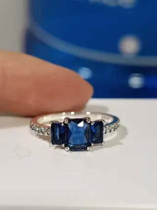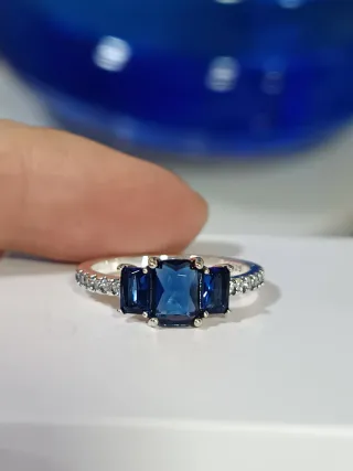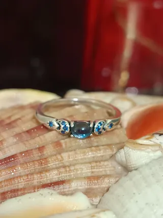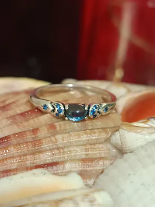 Elegante anillo de plata S925 con un diseño delicado. - Centro con gema azul. - Detalles de circonitas azules a los lados. - Montura de plata 925. Talla 56/16