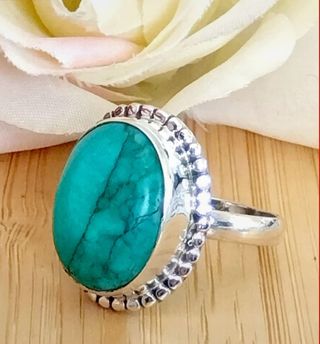 Anillo llamativo con una gran piedra de turquesa engastada en plata. - Diseño único y elegante. - Piedra de turquesa vibrante. Se entrega en cajita para regalo.#(sortijas, alianzas, alhajas, joyas, joyería, pulsera, pendientes, brazalete, tobillera, cadena, cordón, colgante, gargantilla, choker, collar, regalos, complementos, maquillaje, broche, minerales, gemas, piedras preciosas, piedras semipreciosas, piedras naturales, ópalo, ámbar, coral, turquesa, aguamarina, amatista, granate, zafiro, lapislázuli, rodocrosita, fluorita, turmalina sandía, cuarzo, esmeraldas, rubí, rubíes, diamantes, brillantes, topacio, oro, platino, Navidad).