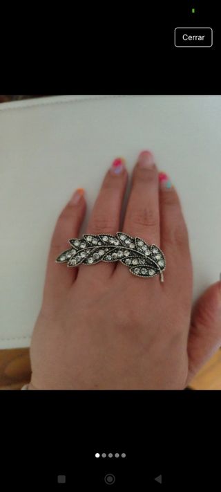 Precioso anillo de hoja con brillantes. Está en muy buen estado. - Diseño elegante y sofisticado. - Material: metal plateado. - Decorado con pedrería brillante.