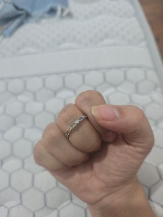 Precioso anillo, ideal para añadir un toque de brillo a tu estilo. - Talla 6 de EEUU. - Diseño elegante y delicado. - Color plateado - Piedras de colores.