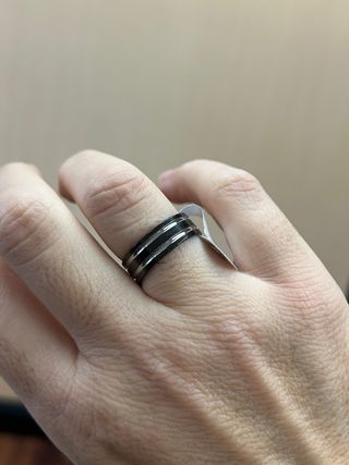 Anillo de acero con un diseño moderno y elegante. - Acabado en negro con detalles plateados. - Diseño unisex.