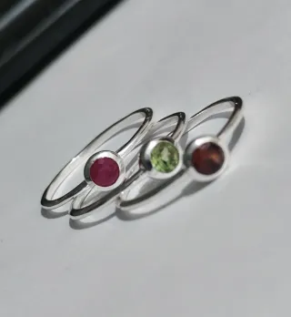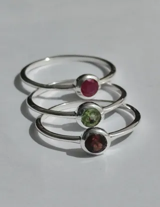 Anillos de plata 925 y piedras naturales (granate, rubí y Olivina) de unos 18,3 mm de diámetro interior. Precio por unidad -- 12€