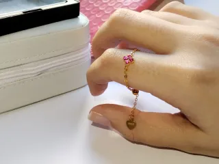 Elegante anillo de cadena con un diseño de flor rosa y un charm de corazón. - Fabricado en plata S925. - Detalles en color rosa. - Diseño ajustable para mayor comodidad. - Aunque es ajustable se recomienda para tallas 14-16.