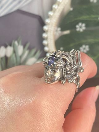 Anillo de plata con un diseño inspirado en Medusa y una tanzanita morada. ❣️ Piedra central: Tanzanita natural ❣️ Material: Plata de ley 925 maciza de alta calidad ❣️ Talla: Ajustable 💝 #natural #anillo #silver #tamañoajustable #tanzanita #tanzanite #anilloplata925 #plata